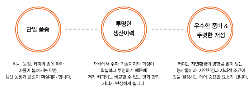 커핑 점수는 산지의 농장 단위로 이루어지기 때문에 산지별 농장의 이름, 재배 환경, 경작 방법 및 가공방식, 품종 등 생산이력을 소비자들이 투명하게 알 수 있습니다.